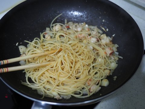 소금과 후추로 간을 하고 껍질은 건져내고 면을 넣고 같이 볶아줍니다.