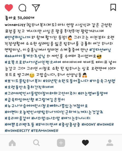 아! 그리고 어느 인터뷰에서 회사내에 무슨 차이점? 같은거 말하는거였나 하여튼 살짝 기분나빠할만한 질문에 승훈이가 재치있게 빅뱅선배님들이 회사를 키우셨으니 자기는 직원복지에 힘을 쓴다곸ㅋㅋㅋㅋㅋㅋㅋㅋ 말한 인터뷰가 있는데 정말로 직원복지를 위해 아낌없는 우리 이차장님 넘나좋은것 멤버들한테 짠돌이소리 들어도 팀위너한테 밥한끼 사주는게 아깝지 않은 우리 이차장님 칭차내!! 승진길만 걷자