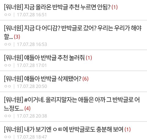 그건 알아둬 너네 때문에 탈판한사람 꽤 있단걸. 특히 개념 워너블들 입장문 올리자고 말해도 ㅂㅁㄱ당했거든. 지금 너네 화력이 부족한건 너희의 업보야