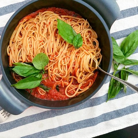 냉장고에 아무것도 없는날 먹는 토마토 소스 스파게티. 그 흔한 소세지조차 넣지 않고 바질만 올렸어요.