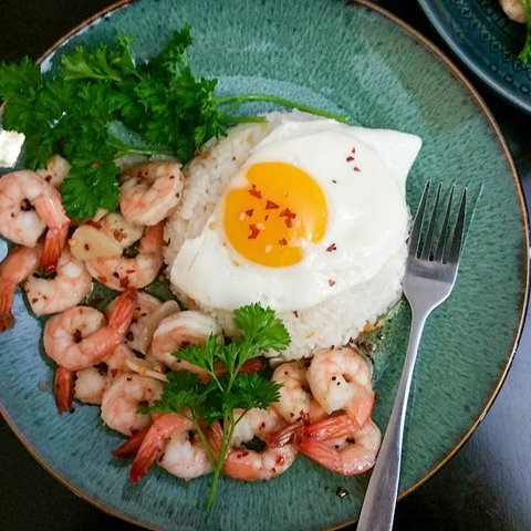 갈릭새우 덮밥. 냉동 새우로 시간 없을때 금방 만들 수 있어 좋아요.