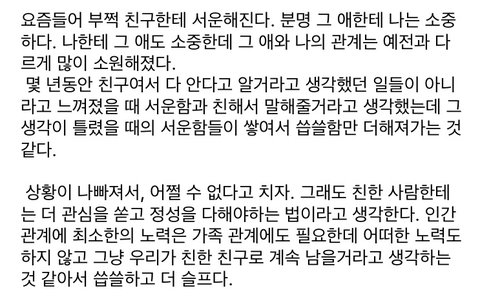 당시 남친에게 미쳐잇던 친구는 쓰니에게 소홀해져서 결국 연락도 안하는 사이가 돼버림 그전부터 난 친구와의 연락에 집착해 매달렷엇고(쓰니가 연락좀 하자고 친구에게 장문카톡도 많이 보냇엇음) 그래도 그친구는 남친에게 미쳐 내말을 귓등으로도 안듣던 상황이엇음 참고로 걔랑 나는 4년 지기임 여기까지 인가보다 나에게도 이런일이 벌어지구나 체념하면서 슬슬 개강하고 대학교 친구들이랑 술마시면서 그친구와 추억을 잊고잇던 찰나에도 문득문득 생각날때가 잇더라 살면서 이런친구 또 만날 수 잇을까 그래도 나랑 진짜진짜 못말할비밀 나누던 사이엿지만 난 당시에 화나서 홧김에 친구와 함께햇던 사진도 다 지워버림 하지만 난 그럼에도 먼저 연락 보낼 이유가 없기에 하지않앗음 자존심 문제도 잇고(왜냐면 친구가 먼저 카톡씹음) 근데 어제 쇼미보는데 걔한테 카톡이 오더라 것도 2달만에 ㅋㅋ내용이 이제와서 이런말하는게 웃긴데 너랑 연락안하면서 많이 반성햇다고 미안하다며ㅋㅋ...너무친해서 날 안일하게 생각햇데..ㅎ내가 연락안해도 계속 자기 곁에 잇어줄줄알앗나봐..나 어떻게 해야돼냐..친구야 그러게 좀 더 빨리 연락하지그랫냐..얼굴 봐서라도 간간히 답장은 해주는데..그냥 솔직히 나 쌍수한 바뀐 카톡 프로필사진보고 궁금해서 연락한거같기도함 대화의 주제가 내 쌍수에 집중돼잇음ㅋㅋ...하....해답좀 주라...
