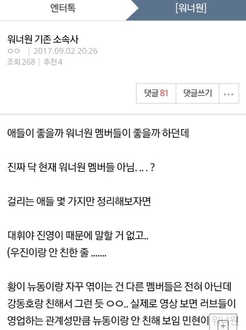 댓글 랭킹순으로 들어가서 추천 가장 많은 먹금 짤 좋아요 눌러주고 절대 댓글 달지말고!! 신고해줘 이거 백퍼 우리 욕먹이려는 ㅇㄱㄹ글이야 워너원 기존 소속사 http://zul.im/0BoINp
