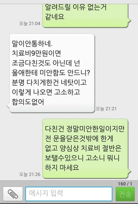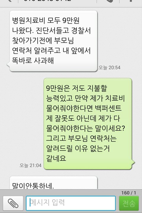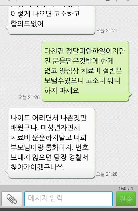 그쪽도책임있다고.모두내잘못은 아라고. 할말은 해야겠다싶어서 다했어. 그랬더니 9시경에 문자로 온게 밑에 사진이야