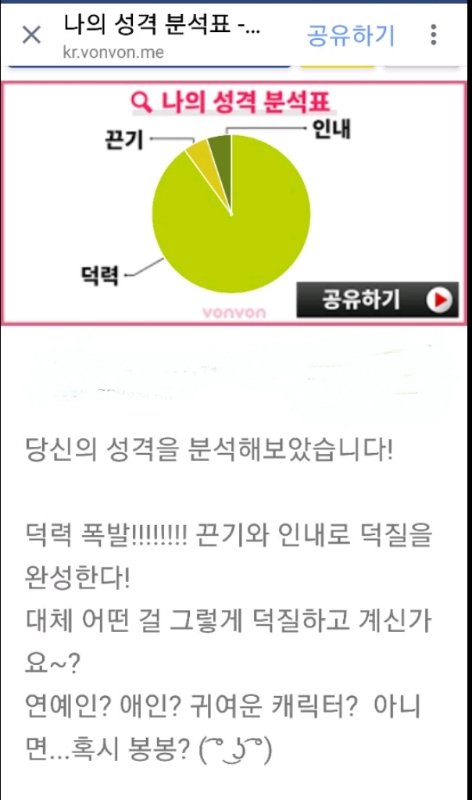 ㅋㅋ 심심풀이 성격테스트 했는데 모이런게 나오냐 ㅋㅋ 내가 요즘 현생불가로 살고있긴하지만 ㅋㅋ 이 덕력으로 내가 챠트순위 최소 두달 유지 시킨다! 내게 있는건 덕력, 끈기,인내뿐!!