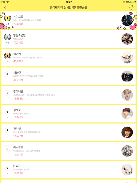 대체이딴순위는 왜매기는거지????다 열심히 해서 여기까지온거고 최선을다해서 활동하고있는데 저렇거순위매겨서 댓글로 사람들싸우는거 보면 희열이 느껴짐?얻는게 대체뭘까...저렇게정성들여 글올릴시간에 덕질1분이라도 더해라 그리고 넌 네 본진 팬덤이랑 가수한테 미안함느껴야됨