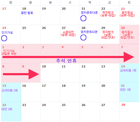 음방 이주? 봄날 일주일했잖아 심지어 음방 이주도 제대로 할 수 있는것도아니야. 파업은 변수니까 그렇다 쳐도 추석연휴+해투는 뭐야 일년에 한국활동이 삼주가 말이됨? 내한가수야?이번에도 대상 그냥 받을 줄 알았는데 활동 삼주....너무하다 진짜 대상 받아도 주변에서 후두려 팰듯 안그래도 이번 컴백 쟁쟁하신 분들 많이 나와서 걱정되는데