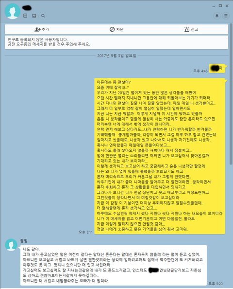 헤어진지 3주째 초반에 엉청 매달려서 매몰차게 차이고 5일전 일부로 번호 삭제 한척 하면 궁금해서 전화나 문자올까봐 카톡 탈퇴한지 5일째 (헤어진지3주째) 결국 못참고 카톡 해버렸습니다 자존감은 엉청낮은데 자존심은 쌘 여자친구입니다. 어떻게 연락을 이끌어 가야 할까요..? 성급히 다시만나자고 하면 안되겠죠..?ㅠㅠ 판 여성분들 조언 해주시면 정말 감사하겠습니다. (여자친구 맞춤법은.. 저한테만 원래 이렇게 말투를 하다보니 맞춤법이 저런겁니다ㅠㅠ)