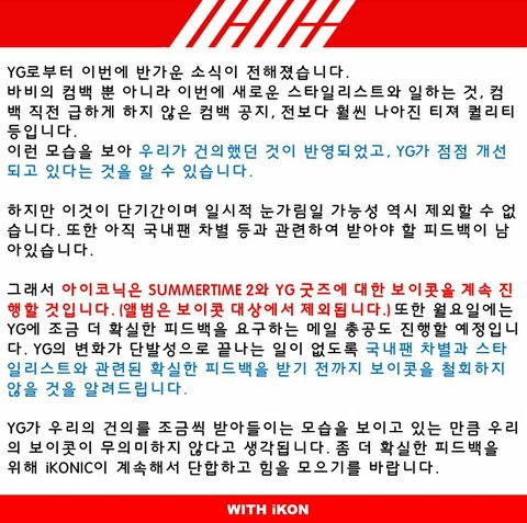 해결된 부분이 많긴하지맠 아직 다 해결안됬으니 보이콧은 계속진행'''보이콧은 굿즈랑 섬타만이구 음원은 안해도되는거니까 우리 최선을 다해서 지원이 받쳐주자