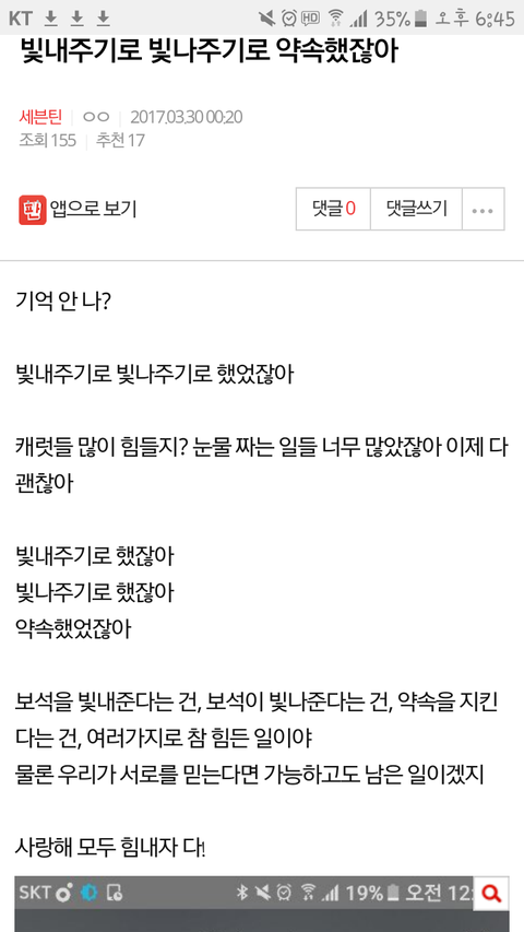 그거알아?캐럿들 팬톡에서 한 달동안 글을 세개나 썼어 글을 쓴 목적과 내용이 민감할 수 있는데 해내는걸 보니까 캐럿들 대처능력이 빨라지고 단합력도 생긴걸 느꼈어 진짜 세븐틴과 캐럿들이 같이 성장하고 있는것 같아