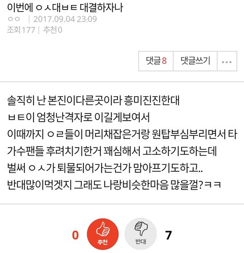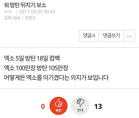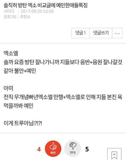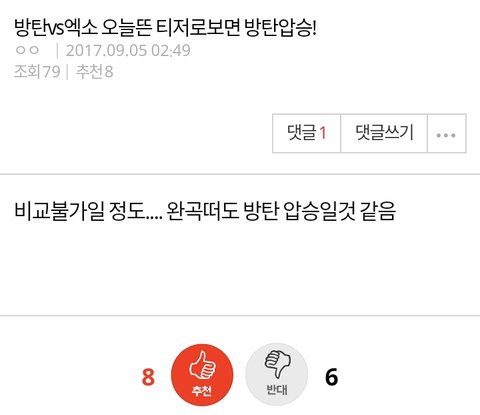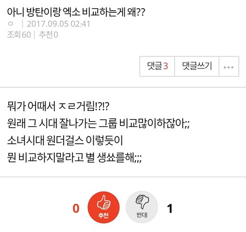 방탄소년단 엑소 비교 글 누가 자꾸 올림 비교라기 보단 후려치기에 가까운 글 밖에 없던데 머글인 내가 봐도 짜증나네 할짓 없는 어그로들이 계속 글 올리는거 같은데 니들이 그렇게 글 올려봤자 뭐가 달라짐 대체 내가 봤을땐 아미는 좋은 결과에도 자만하지 않고 엑소엘도 열폭같은거 없어 보이는데 ㅋㅋ 그렇게 어그로 끌어봤자 두 그룹은 망할일 없음 정신 좀 차려