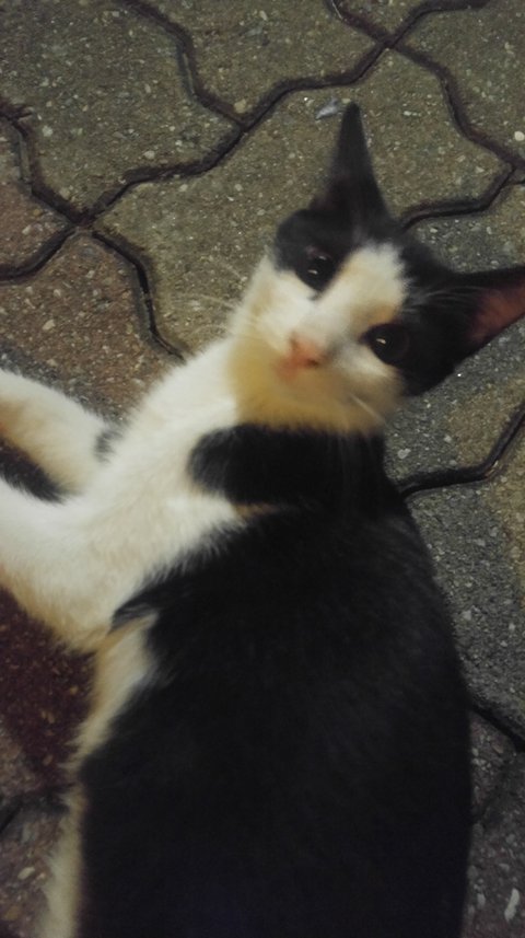 3-4개월정도 된 고양이고 사람 손에서 자라서 애교가 워낙 많아서 동네 지나가는 사람들이 꼭 집앞에 고양이 불러서 이뻐하구 동네 마스코트가 되었어요.