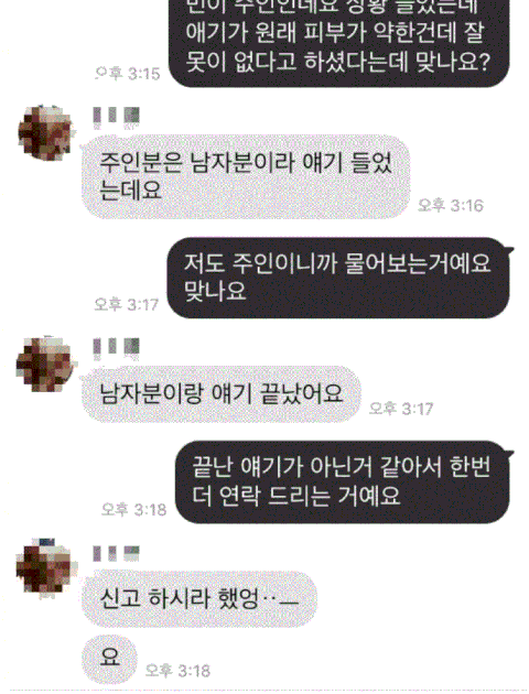 주인: (말 안통함..) 됫고, 병원데려가서 치료비 청구 할거예요
