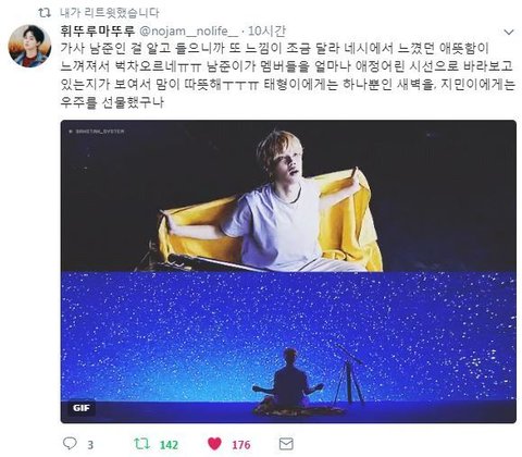 가사로 마음 표현하는게 정말 아름답고... 본보야지에서 하와이 밤하늘을 보면서 별 봤냐고 하는 짐니 보고 가사를 쓴것 같다는 소리도 있음ㅠㅠ 사실은 모르지만 만약 맞다면 은근 안듣는척 흘러보낼만한 소리를 다 귀담아 듣고 마음에 저장해두는 것 같아 ... 정말 사랑스럽다 ㅠㅠ