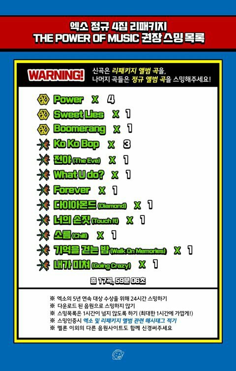 니네 설마 리팩에 수록되어 있는 코코밥 포함 10곡 돌리는 거 아니지? 리팩에 수록되어 있는 건 POWER , Sweet lies, 부메랑 만 나머지는 THE WAR 앨범 수록곡으로 돌려야 돼 제발 다시 한 번만 확인들 해주라
