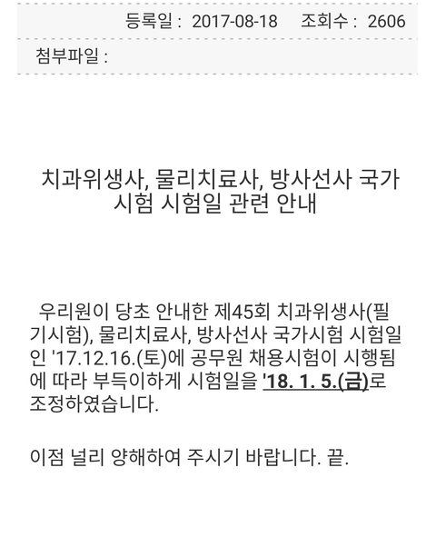 학생들은 국가고시를 위해서 3년 또는 4년동안 열심히 달려왔습니다. 그리고 이제 그 결실을 맺을 때 입니다. 그런데 어느날 타당한 이유도 없이 갑자기 공무원 추가합격자 시험을 위해 저희의 시험을 18년 1월 5일로 연기했습니다.