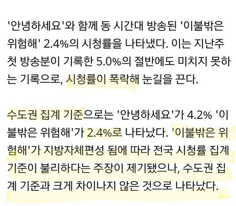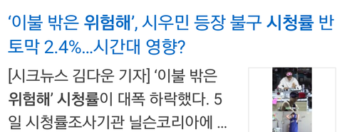 수도권에서도 2.4%로 폭락,,,, 기자가 팩트폭행 오지네 시청률 폭락한건 전국 방송 안되서였다고 핑계대던 팬들 조용히 반대 누르고 튐,,,,