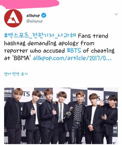 엑스포츠는 그동안 방탄 컴백날짜 유출,한터차트가 방탄 편애한다는 기사 등등 안좋은 기사 씀 근데 오늘 일이 터짐 방탄이 빌보드관련 기사쓰고 부당하게 받은거면 돌려줘야 되니 뭐니 올림 빌보드상=아미들이 엄청 투표 빡세게 해서 탄 상(물론 후보에 든건 방탄이 대단해서 ㅇㅇ)아미들 개빡쳐서 해외팬들한테 알리고 해외팬들알고 빡쳐서 2시간만에 45만개가 넘는 트윗이 올라와 월드실트1윜ㅋㅋㅋ기사는 내려감 빌보드 기자도 트윗올림