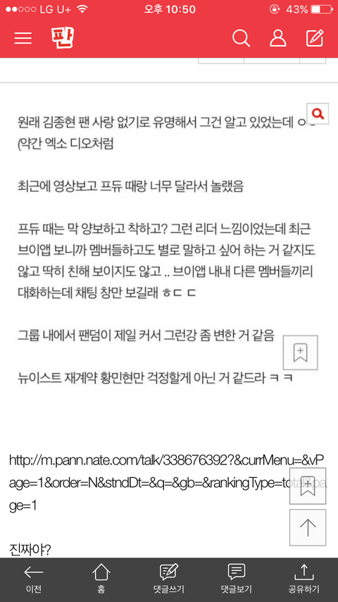 ㅋㅋㅋㅋㅋ 내가말야 예전에 데뷔때부터 슈스를 파다가 해체 후 탈덕하고, 지금 뉴이스트를 파면서 가장 크게 느끼는게 팬사랑이야. 구 오빠들은 해맑은 표정으로 방송때마다 팬 여러분 사랑해요! 를 달고 다녔거든. 비지니스인거 알면서도 그 비지니스 멘트에 또 넘어가는게 팬심 아니겠어. 근데 뉴이스트는 그런 말 안하드라. 그냥 팬 여러분 너무 고맙다. 우리 노래가 계속 차트인 되는데 너무 좋아서 한시간 간격으로 확인하느라 못잤다. 이렇게, 팬에게 뭘 받았는가를 구체적으로 알려주는 멘트들. 그리고 손글씨 역조공이라든가... 구 오빠들의 팬 사랑은 수혜, 성은이 망극한... 이런 느낌이었는데, 뉴이스트는 팬과 가수가 대등한 관계에서 주고받는 느낌이 들어. 서로가 서로에게 천국이라는 말 처럼 받은 만큼 주고싶어하고 말보다는 행동으로 자신이 받은 감동을 표현하는 느낌. 러브 화력 여기서 나오는거 같아. 솔직히 다들... 받은 만큼, 아니 그 이상 주고 싶잖아?