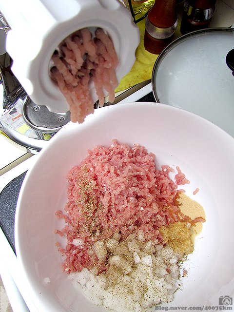 케이싱을 물에 불리는 동안 고기와 부재료 섞은 것을 두 번 정도 더 갈고 손으로 잘 치대서 준비합니다.