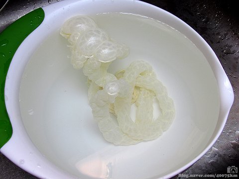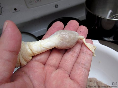 이번에는 돼지 창자를 사용하기로 합니다. 세척된 돼지 창자가 소금에 파묻혀서 판매되는데, 일단 물로 한 번 씻어낸 다음 속까지 물을 채워 30분 정도 불렸다가 깨끗하게 닦아냅니다.