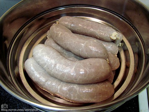 원래는 소금물에 삶아서 염장하는 것이 원칙이지만, 이미 고기 반죽 단계에 소금을 넉넉히 넣어둔 관계로 이번에는 그냥 증기에 찌도록 합니다.