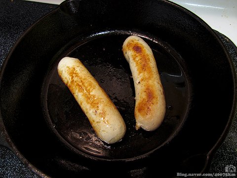 무쇠팬에 기름 좀 두르고 소시지를 지지고 있노라면 향기로운 냄새가 솔솔 풍기기 시작합니다.