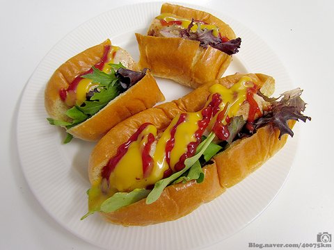 핫도그 빵에 샐러드 야채를 조금 깔고, 소시지를 얹은 다음 토마토 케첩과 머스타드 소스를 듬뿍 뿌리면 완성입니다.