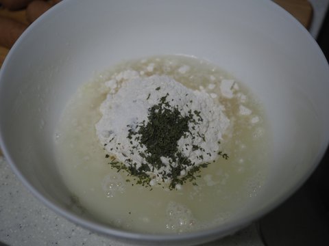 튀김가루 종이컵 1컵에, 물 반컵을 넣고 저어서 반죽을 만들어줍니다. 저는 파슬리 가루를 조금 넣었는데 없어도 정말 무방합니다.