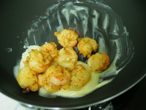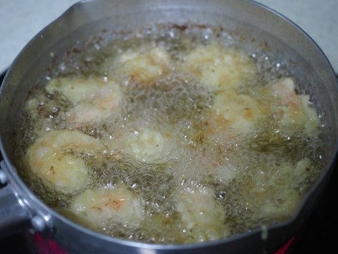 그 반죽에 새우들을 담고 튀김옷을 두껍게 입혀줍니다.