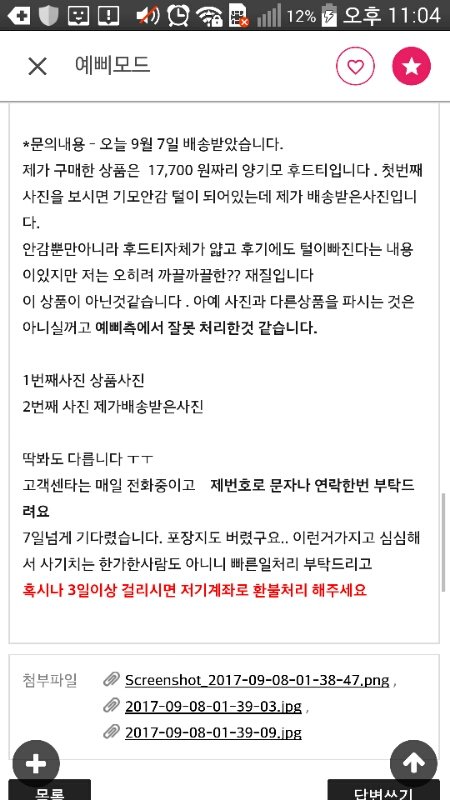 다른 후기들은 기모털이 너무빠진다 라고 많이 남갸주시는데 아예다른상품 받고 배째라는식 인것 같습니다 .
