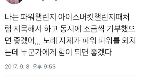 짹에서 이글 봤는데 파워 노래 자체가 힘이 나는 노래라는 걸 강조해서 팬들끼리 기부하면 어떰 작은 500원이더라도 이렇게 좋운쪽으로 하면 블베에도 자연스레 올라가고 정화할 것 같은데 스엠 연결해야하나?