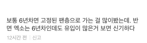 덕구방에서만 봐도 엑소는 끊임없이 팬들을 유입하는 그룹이야. 그럴 때마다 나는 정말 엑소가 6년차 중년 아이돌이 맞나 싶은 생각이 많이 들었었어. 게다가 100위 차트 안을 차지하고 있는 몇몇의 아이돌 중 최장수 그룹이기도 해. (거기서 차트 상위권 유지중)