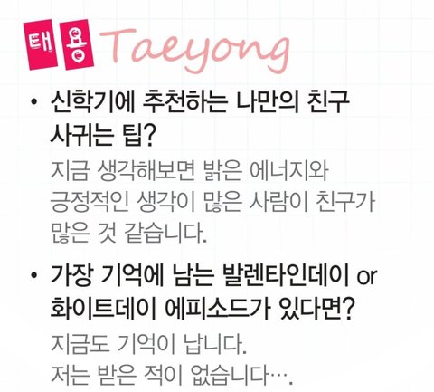 같은 멤버인 재현이가 태용씨가 아르바이트 했던 식당은 여자손님한테 인기가 많았겠네요~ 했더니 전혀 그렇지 않다며 극구 부인한걸 보면, 정말.. 다가온 사람이 없었나봄..