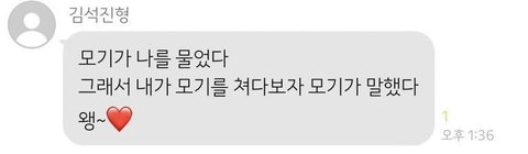 한시간 반이 넘도록 아무도 답장안하면 왜 아무도 반응 없어~!! 할만한데 ㅋㅋㅋㅋㅋ 그동안 얼마나 많은 드립을 치면 저 개그에 아무도 대답을 안하냐 ㅋㅋㅋㅋ 난 너무 웃긴데 ㅋㅋㅋㅋㅋㅋㅋ 맨날 무시당해도 꿋꿋하게 드립치는 석진이도 대단 ㅋㅋㅋㅋ
