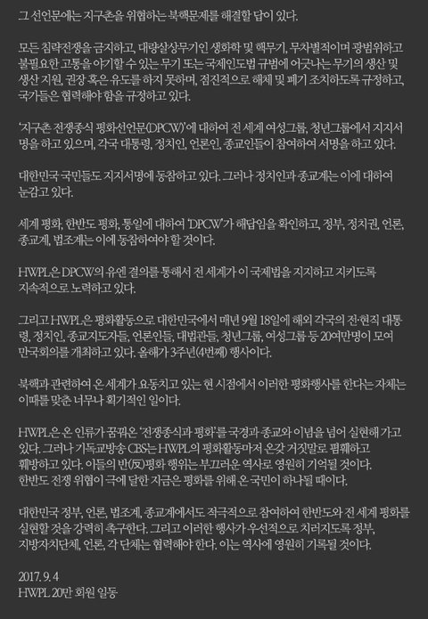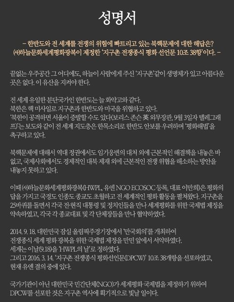 그런데 오늘 기사 검색하던 중 HWPL 평화단체 에서 성명서를 발표 했더라구요.