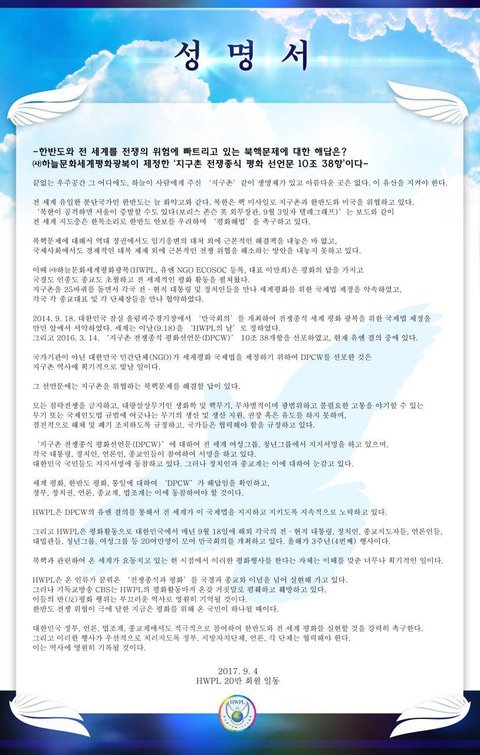 얼마전 (사)하늘문화세계평화광복(HWPL)에서 발표한 성명서가 있는데요