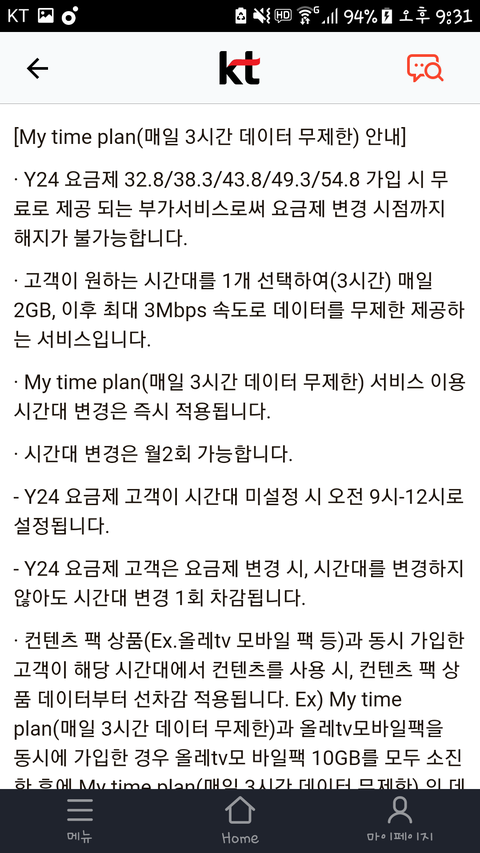 KT쓰는 사람들은 Y24?이용제 쓰면은 시간 정해서 무제한 데이터 3시간 쓸수있어!!