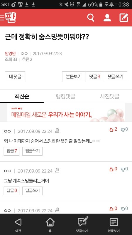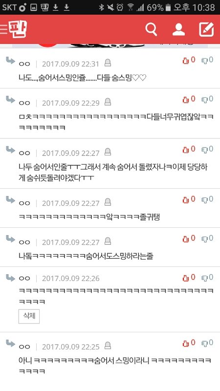 숨스밍 뜻 모르는 방토가 글 올려서 뜻을 어떤 방토가 알려줬는데 숨어서하는 스밍이라니ㅋㅋㅋㅋㅋㅋㅋㅋㅋㅋㅋ아 너무귀여워ㅋㅋㅋㅋㅋㅋㅋㅋ 방토들 이제 당당하게 스밍해 알았지ㅋㅋㅋㅋㅋ