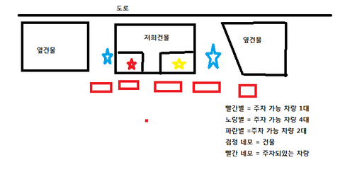 그림판으로 그린 주차되있는 풍경입니다. 별있는데가 제가 살고있는 원룸주택입니다.