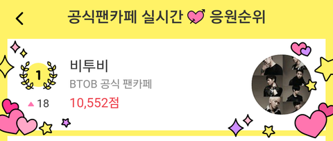 본진 다1음 공캎 들갔다가 ㅈㄴ깜짝 놀랐네 갑자기 비투비 응원하기 1위하고 18위나 급상승 했는데 갑자기 미친건가 뭐야 뭔일이야..