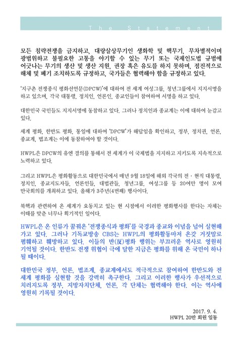 대한민국의 평화를 지켜줄 HWPL의 성명서를 꼭!! 읽어보셨으면 좋겠습니다.