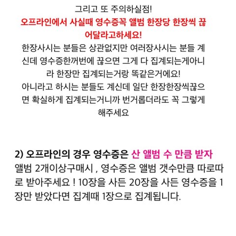 또 오프에서 앨범 여러장 살때는 하나하나 구매를 해야해! 한장계산하고 영수증떼고 하나하고 영수증 하고 ! 온라인에서도 마찬가지이고! 하나계산하고 또 하나계산하고!! 왜 이러냐면 누락의 가능성이 있데~ 좀 귀찮고 번거롭지 ㅠㅠ???