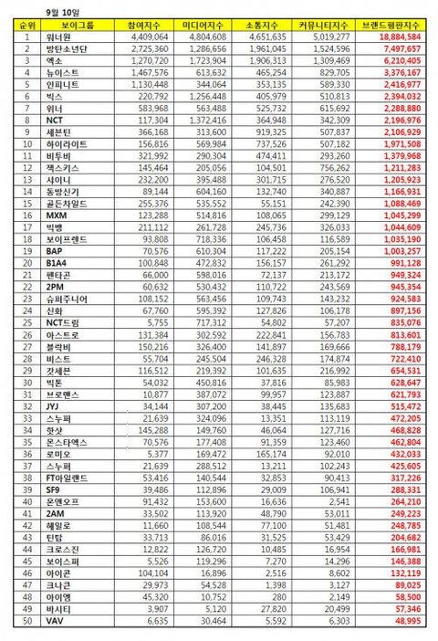9월 보이 그룹 브랜드 평판지수