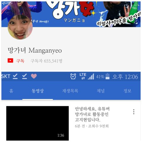 댓글보다 소름돋아서 글 남겨 내가 이 글은 쓴건 12시야 딱 정각에 썼고 댓글들 말 들어보니까 망가녀도 12시에 영상을 올렸대. 댓글 확인하고 내가 직접 유튜브 들어가서 영상 봤어. 사진 보다시피 난 망가녀 구독도 안했을 뿐만 아니라 관심 없어하던 사람이야.. 그냥 꿈에 나와서 쓴 것 뿐이고. 두번째 사진 보면 6분 전에 업로드 된=당시 캡쳐될때 사진은 6분이므로 내가 구독도 안 된 영상을 보고 60초 안에 글을 쓰러온건 말이 안되잖아 암튼 나도 소름돋네 그럼 난 이만