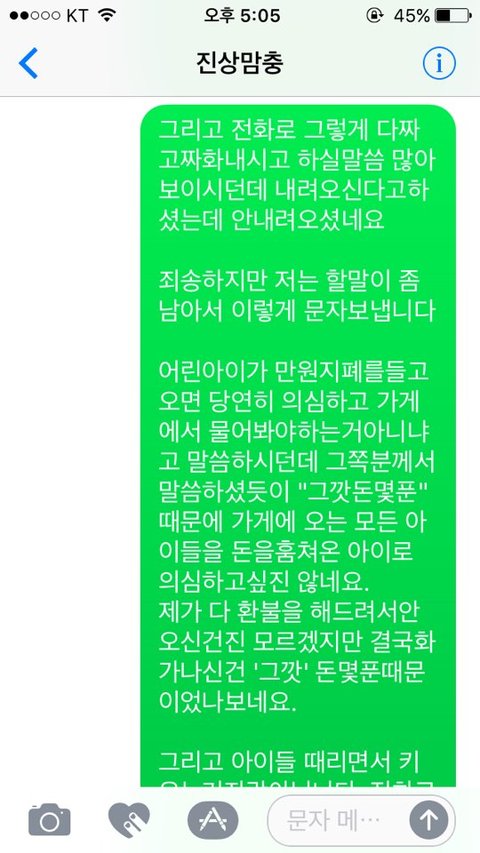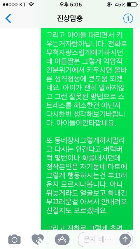 동네장사 그렇게하지말라고 동네드립을 치면서 낮에도 남편이랑 음료수 사먹으러 갔었는데 내가 다시는 거기 안간다면서 그깟 돈 몇푼때문에 자기가 이러는거 같냐고 전화로 소리 빽빽지름 지새끼 훈육하듯이