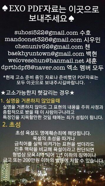 엑소팬분들의 노력이 필요합니다. 힘들겠지만 조금씩만 힘을 모아서 악플러들에게 정당한 죗값을 받게해야 합니다.