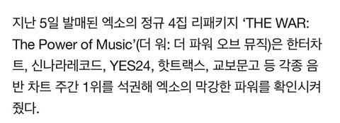 엑소, 정규 4집 리패키지 주간 음반 차트 1위 석권