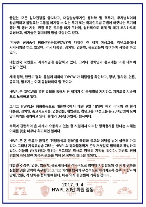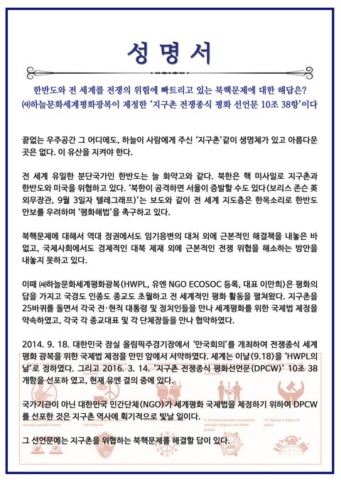 요즘 핫이슈인 북핵문제해결법은? HWPL 성명서에 명확한 해결법이!!