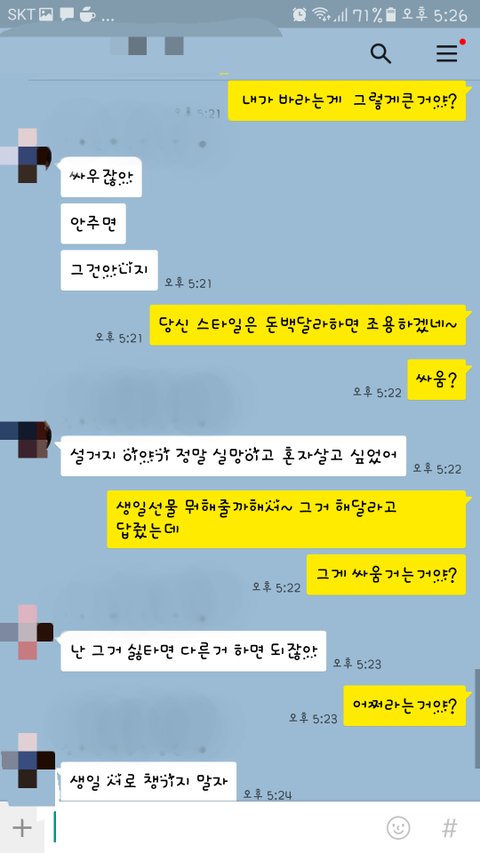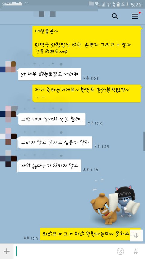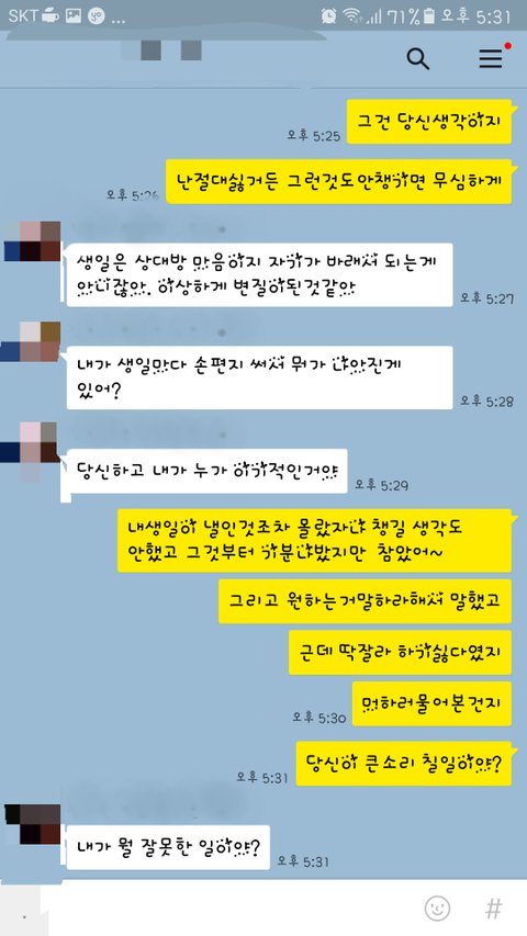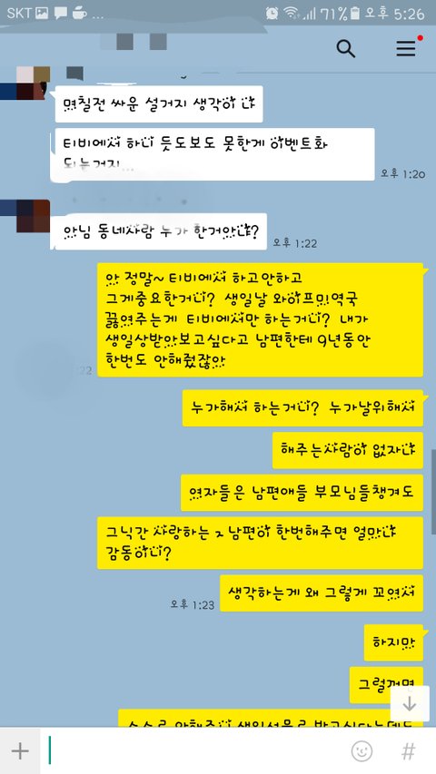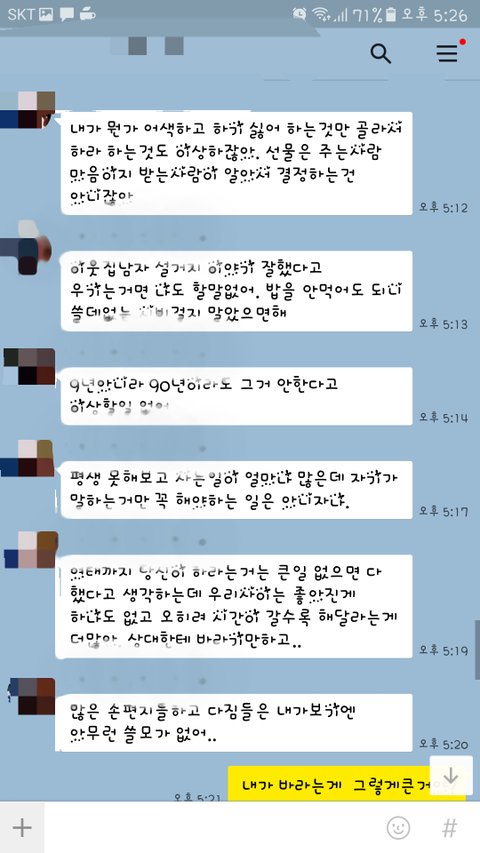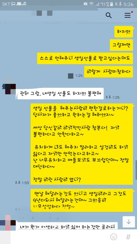내일이 생일인것도 잊고 있다가 제가 말하니 그때서야 생일선물 뭐줄까 하고 물어 봐서 미역국생일상 이랑 손편지+알파라고했는데~ 톡내용이 이래요~ㅜㅜ 9년동안 결혼해서 아들쌍둥이낳고 살고 있는데~ 한번도 생일날 미역국